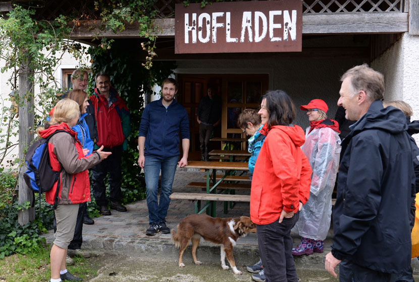 Alle Bio-Produkte aus den Kooperationen und weiterer namhafter Bio-Hersteller bietet Andreas Maier in seinem Hofladen an. Dazu erhält der Verbraucher Rindfleisch von Tieren aus eigener Weidehaltung, Eier von eigenen Legehennen und gelegentlich Schweinefleisch. Neben der Direktvermarktung und dem Ökoackerbau zählen die Mutterkuhhaltung, Erzeugung von Bio-Futtermitteln sowie Zuchtsauen, deren Ferkel zur Mast weiterverkauft werden zu den Betriebszweigen des Biohofs in Waldering. Zur Verkostung servierte Andreas Maier die „Waginger See Hoibe“. Zu dem herben Biobier genossen die Teilnehmer das in diesem Jahr unter „Bayerns besten Bioprodukten“ ausgezeichnete „Flaschlbrot“. Alle drei Sorten enthalten die ertragsarme, aber durch ihre hohen Inhaltsstoffe überzeugende Ur-Getreidesorte „Laufener Landweizen“ als Spezialität aus dem Rupertiwinkel. Der Ökoackerbau funktioniere gemäß Andreas Maier nur, „wenn der Landwirt jeden Tag seine Pflanzen begutachtet und nachsieht, was zu tun ist“. Das „A und O“ sei für ihn die Bodenpflege: keine Verdichtungen erzeugen, nicht mit schweren Maschinen in nasse Felder hineinfahren und die Regenwürmer pflegen und füttern, „denn sie sind die wichtigsten betrieblichen Mitarbeiter“.