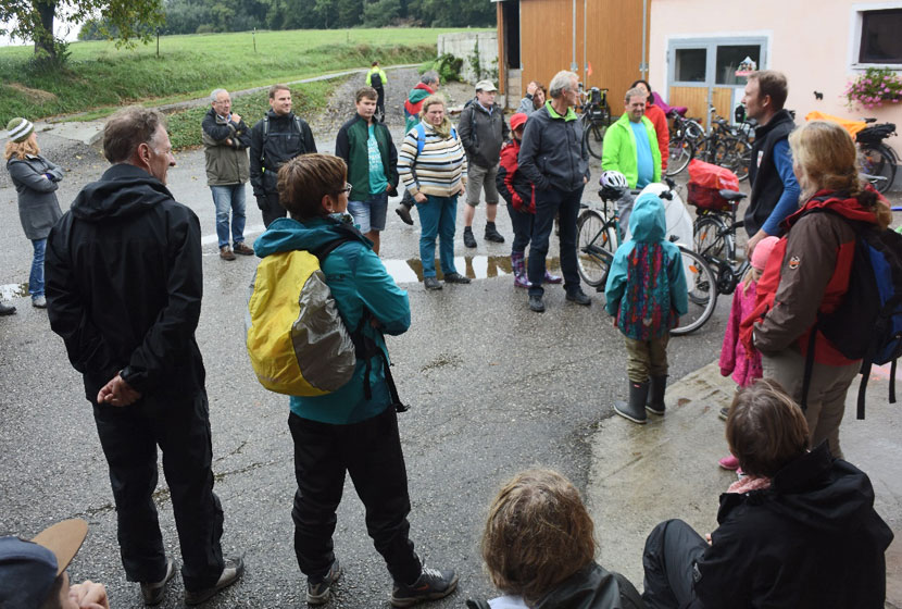 Als ersten Genuss des Tages hatte Jutta Staudt-Franzen, Betreiberin des Bio-Hofladens auf dem Biohof Glück in Grassach, ein üppiges Frühstück aus regional hergestellten Bio-Produkten zusammengestellt. Die Teilnehmer ließen sich schmackhaftes Brot und diverse Milchspezialtäten schmecken. In liebevoller Handarbeit hergestellte Marmeladen, das heimische Granola-Müsli mit Leinöl, hofeigenes Obst und Eier sowie ein leckerer Apfelkuchen aus Äpfeln von der eigenen Streuobstwiese standen auf dem Tisch. Als herzhafte Ergänzung hatte Jutta Staudt-Franzen eine Mangold-Quiche gebacken und reichte Käse aus der Ökomodellregion, hofeigenes Gemüse und Wurst vom Biobetrieb Kettenberger, welcher als gesonderte Station der Genussradltour besichtigt wurde. Dem kühlen und regnerischen Wetter zum Trotz machten sich die gegen Wind und Wetter ausgerüsteten Radfahrer fröhlich und gut gestärkt auf zur nächsten Station. Über das Quellgebiet von Maria Ponlach, vorbei an der Burg Tittmoning führte sie der Weg zum Biohof von Andreas Maier in Waldering.