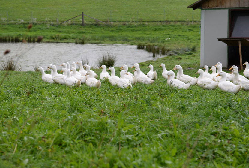 Bei der Betriebsführung auf dem Biohof Kettenberger können sich die Teilnehmer der Genussradltour von den mit viel Auslauf glücklich in kleinen Gruppen gehaltenen Enten und anderen Geflügeltieren überzeugen, Bild von Jessica Linner, ÖMR.