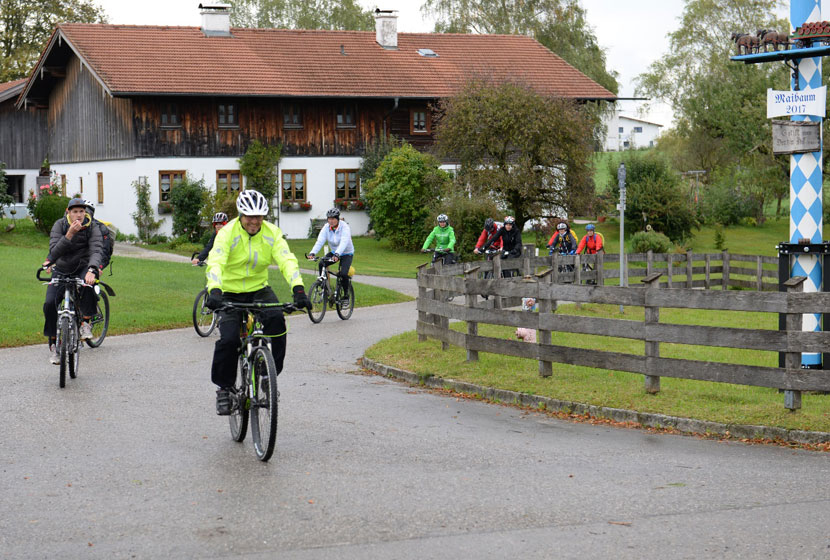 Über Kirchheim radelte die Gruppe weiter nach Kay, wo Johann Englschallinger sie auf seinem Bio-Milchviehbetrieb begrüßte. Der Besuch stand als Exempel für die das Chiemgau prägenden klassischen Milchviehbetriebe. Zur Verkostung reichten die Gastgeber fruchtige Bio-Buttermilch aus dem Bio-Sortiment der von ihnen belieferten Molkerei Berchtesgadener Land. Bei einem heißen Kakao aus hofeigener Bio-Milch wärmten sich die Teilnehmer auf, bevor die nächste Station in Kettenberg auf sie wartete.