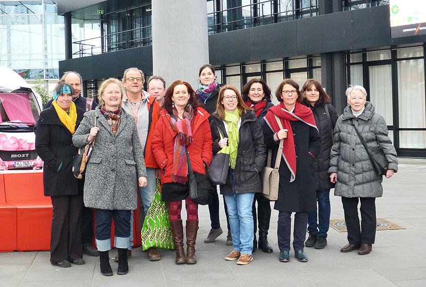 Die Gruppe aus der Ökomodellregion Waginger See-Rupertiwinkel fuhr mit dem Zug zur Prämierung nach Nürnberg, Ankunft vor der Messehalle (nicht auf dem Bild: Elke Ott und Bärbel Forster), Bild von ILE.