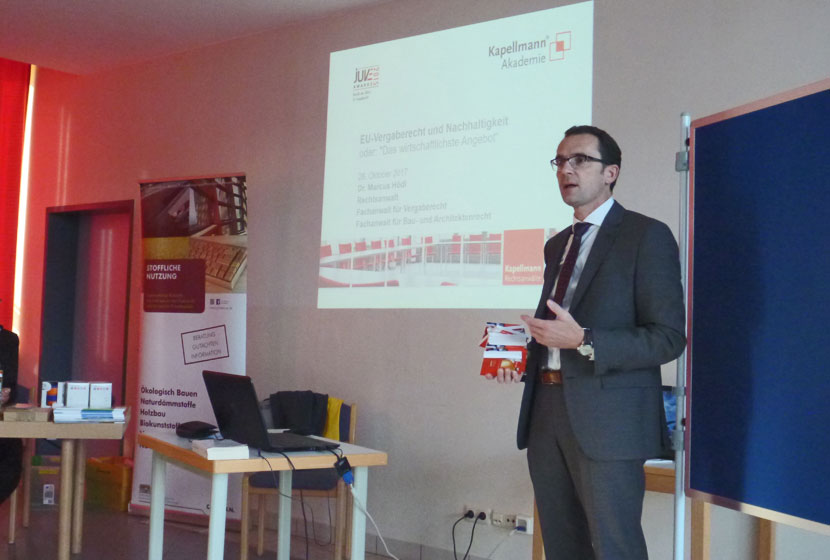Der Rechtsanwalt, Dr. Marcus Hödl Fachanwalt für Vergaberecht, Bau- und Architektenrecht bei Kapellmann und Partner Rechtsanwälte referierte zum Thema Vergaberecht und Nachhaltigkeit, Bild von ILE.